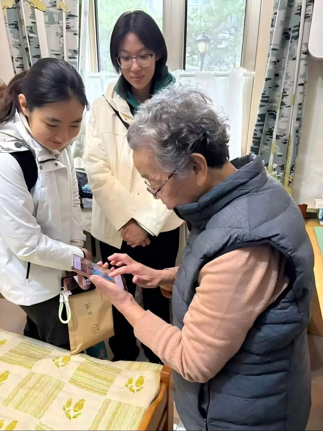 走过几户人家,不同的场景让我心里泛起波澜。有的老人独自在家,安静地坐在沙发上,见我们来便慢慢坐直身子,眼神里带着一丝不易察觉的欣喜;有的老人已失去自主活动能力,由保姆照料着,只能用轻声的“谢谢”回应我们的问候。没有过多热闹的寒暄,但那份“被记挂”的感动,在安静的房间里格外清晰。