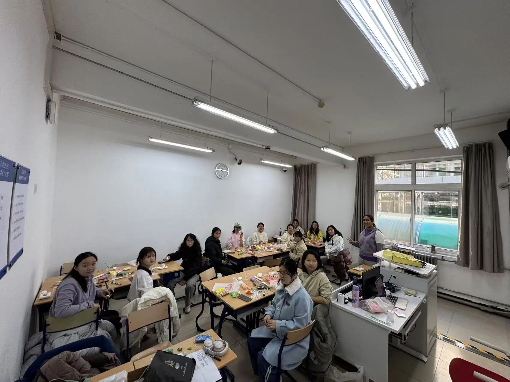 粘土diy活动流程包括流程介绍、材料工具介绍、制作教程讲解、动手制作和交流与分享。在活动中,同学们制作了酷似云朵、有着幸福内馅的饺子,把它作为钥匙扣或者挂坠携带,引来对其可爱神态和手工能力的夸赞。活动接近尾声时,许多同学们都献上了自己富有创意的作品,包括但不限于曲奇挂坠,胡萝卜挂坠和其他神态生动的人仔。