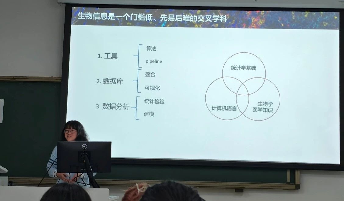 同时,楚晓菁老师还向各位同学介绍了自己的成长经历。她提到自己本科期间一直都是比较普通的一员,之所以走到现在,是因为自己一直没有放弃。关于为什么选择生物信息学,老师讲到,是源于高中时期参加的科研社会实践项目,用生物信息学进行帕金森药物的虚拟筛选。即便在当时高考的环境下,参加科研社会实践是一件看似费时费力又没有回报的事情,但后来在本科期间,她借助该项目获得了“课外学术论文奖”时,努力第一次获得回报。同时,也因为这个奖项获得了保研加分。再后来老师的博士文章中用到的PyMol软件作图,也是源于高中时期的学习。老师说,我们做过的每一件事都会在适当的时候反馈回来,只要不放弃。