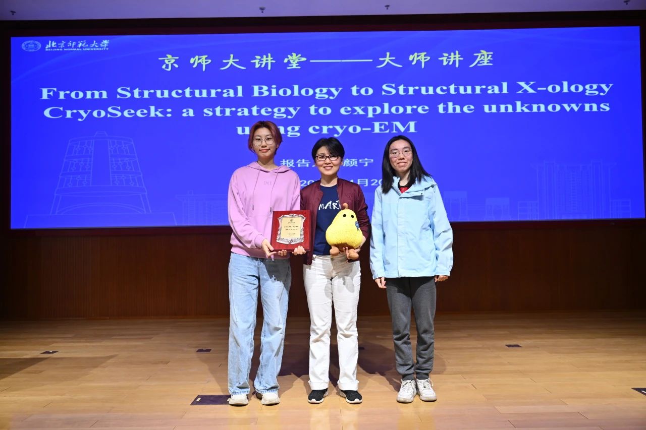 活动的最后,北师大生物学社和生科院学生会的学生代表向颜宁老师赠送“京师大讲堂”纪念牌和象征着“永不分离”的梨形玩偶,既纪念师大学子与颜宁老师的思想碰撞,也象征科学与探索精神的永恒联结。