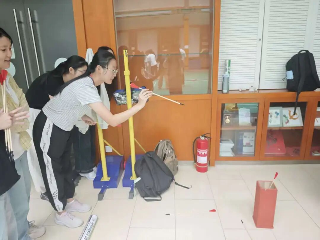 投壶项目以小组为单位参赛,组内成员轮流投掷,每人投五次。同学们拿起箭矢,有的多次尝试小心翼翼投出,有的干脆利落出手,投壶场地时不时传来欢呼声。