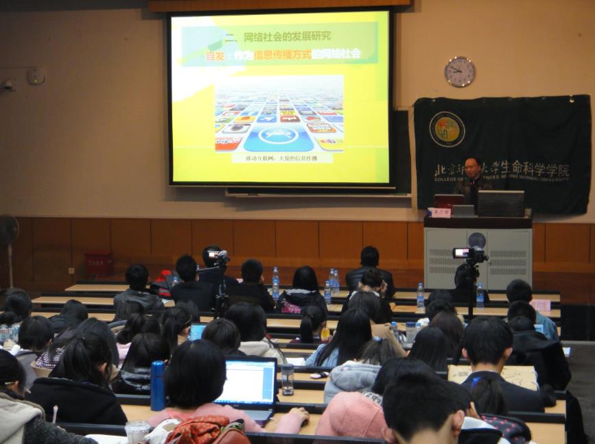 晚8:00,讲座正式开始。蒋广学教授以“为芙蓉姐姐平反”和“为斯诺登先生撑腰”两个实例为引子开始了精彩的讲座。随后,蒋教授分别从网络社会的影响、起源发展、本质初探三个方面阐述了对网络社会深入精辟的看法,条理清晰地向同学们展示了网络社会的前世今生及未来。最后,蒋教授诚恳地给予同学们一些网络方面的建议,鼓励同学们正确看待网络社会,趋利避害、做一位新时代下新师大的新青年。最后,讲座在学生会主席马迪向蒋教授献花和合影留念中圆满结束。