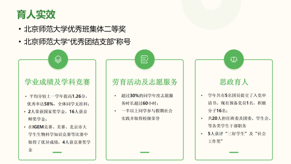 本学年班级学生学业成绩稳步提升,班级整体优秀率达到了58%,全体同学无挂科记录。2人荣获国家奖学金,16人荣获京师奖学金;班级同学在IGEM竞赛、美赛、北京市大学生生物科学知识竞赛等比赛中取得了优异成绩,4人获竞赛奖学金。生科2022级1班获评本学年度“北京师范大学优秀班集体二等奖”。