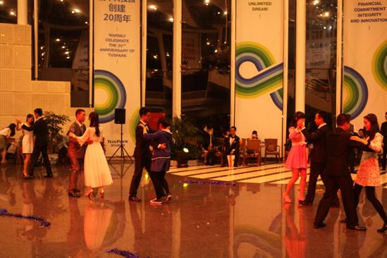 随后在四位主持人的引导下,每位同学通过随机取号的方式找到了自己的舞伴。在第一支舞结束后,13级的五位同学为大家带来了精彩的表演,现场气氛十分热烈。随后主持人开始了激动人心的抽奖环节,将舞会推向高潮,其中有14位同学幸运地拿到了礼品。紧接着第二支舞曲开始,男生女生相互配对,迈着优美的舞步款款起舞。第二支舞结束后,大家兴致高涨,围成一个圆圈跳起舞来,每个人脸上洋溢着笑容与兴奋,大家说着笑着,做着游戏,将舞会又一次推向高潮。