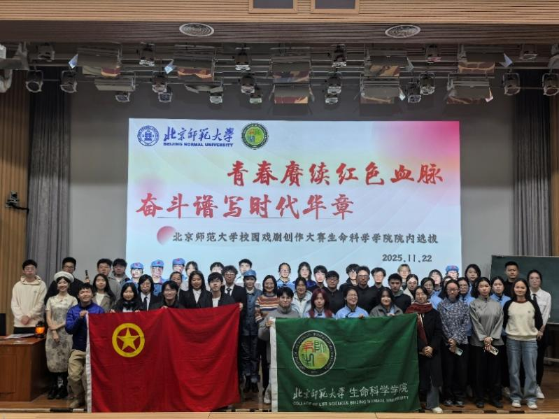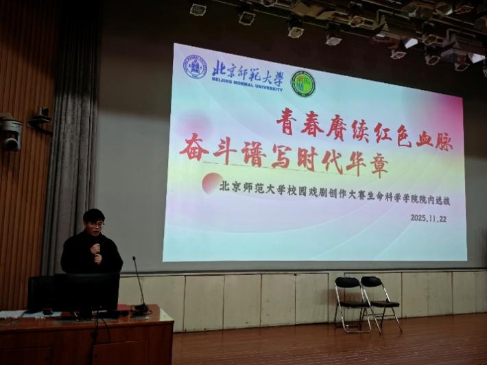 2025年11月22日,北京师范大学“青春赓续红色血脉,奋斗谱写时代华章”校园戏剧创作大赛生命科学学院院内初赛在敬文讲堂成功举办。本次比赛旨在深入学习贯彻落实习近平新时代中国特色社会主义思想、庆祝中华人民共和国成立76周年、纪念中国人民抗日战争暨世界反法西斯战争胜利80周年,同时筛选优秀作品递交校团委,生命科学学院全体青年学子积极参与,呈现了一个又一个精彩绝伦的舞台。本场比赛由团促部干事程宇轩同学主持。