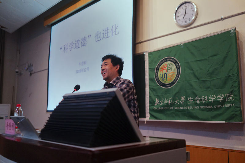 2016年12月4日晚,由生命科学学院举办的“治学修身系列活动之科学道德也进化”圆满成功,本期讲座主讲人是生命科学学院的牛登科教授,到场的嘉宾还有生命科学学院的殷实老师等人。讲座围绕科学道德也进化的主题,从韩春雨事件入手,分别就韩寒事件以及Nature子刊的要求正反两方面剖析了其中涉及到的道德问题。再以对学生的美好希冀作结,希望本次牛教授的一番好意,能够深深的引进听众的心里,并且把诚信这一个关键词传递出去。