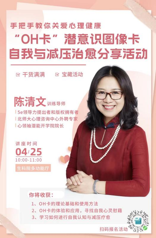 4月25日,生命科学学学院学工办举办辅导员心理赋能沙龙,本期主题为“‘OH卡’”潜意识图像卡自我与减压治愈分享”。北京师范大学心理咨询中心外聘专家、ICF(国际教练联盟)北京分会前副会长陈清文老师带领学院专兼职辅导员就如何进行自我认知与减压疗愈进行深入分享。