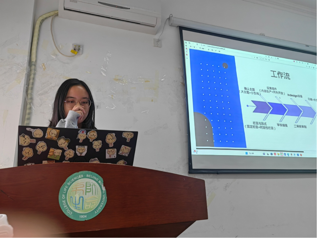 生科院融媒体中心以“专业+创意”为特色,通过部门协同与流程优化,打造出兼具学术深度与生活温度的融媒体内容。据中心主任曹佳鑫介绍,中心下设秘书处、创作部、新闻部、文创部四大部门,分工明确且紧密联动。秘书处作为“后勤中枢”,负责团队建设、技能培训和财务保障;创作部主导科普推送制作,通过“四级审核”机制把控内容质量;新闻部则聚焦官方公众号运营、人物采访与院刊《绿缘》编辑。