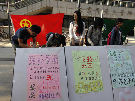 5月7日下午,生命科学学院《绿缘》编辑部在邱季端体育馆南侧举办了主题为“飞扬五四,我的师大青春”的感言征集活动,以此纪念五四运动95周年,传播弘扬五四精神。