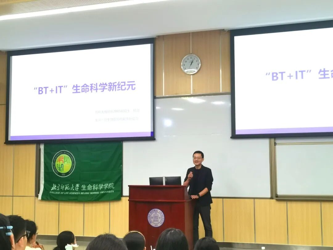 2002级硕士校友、现任北京馨智生物医药公司总经理侯剑,以“‘BT+IT’生命科学新纪元”为题,分享了自己从科研到创业的成长轨迹,并结合当前深耕生物科技投资与成果转化的实践,深入交流创业思考。他还介绍了作为创业者的工作内容与日常状态,提炼实用职业建议,并以“未来已来,顺势而为,先学做人,再学做事”为寄语,鼓励同学们把握行业机遇。